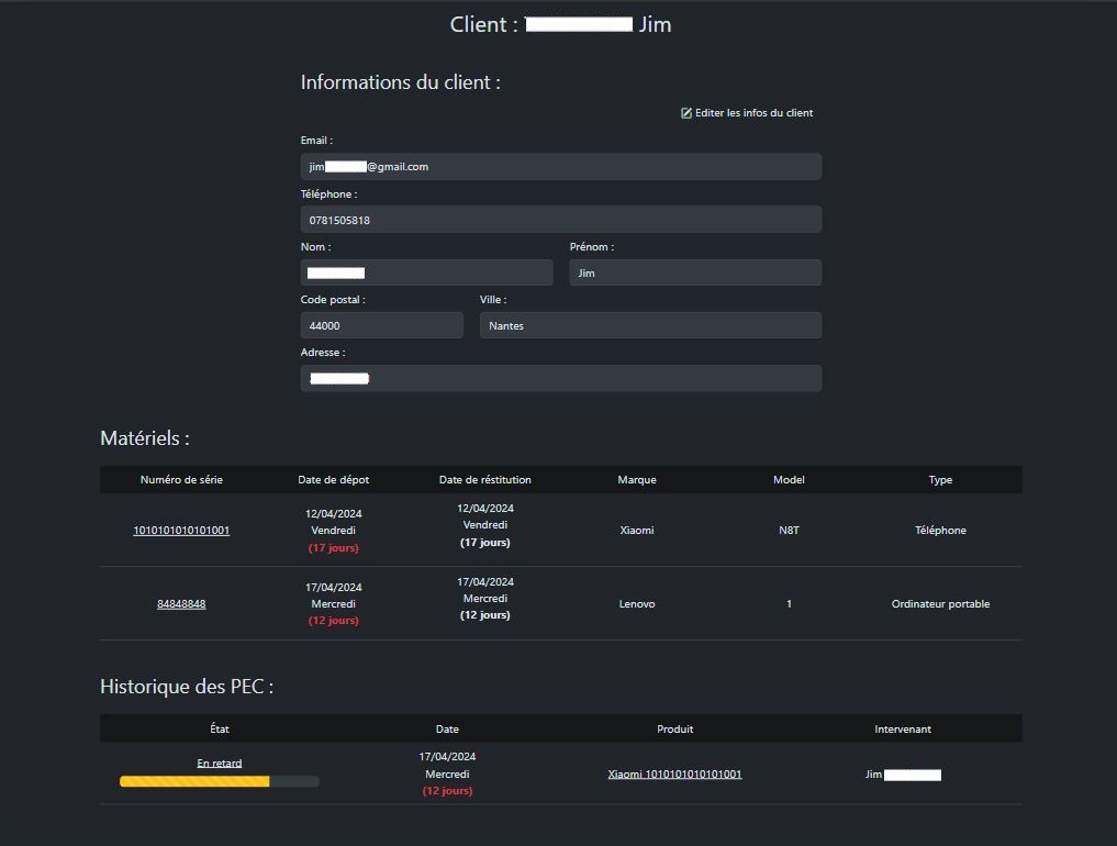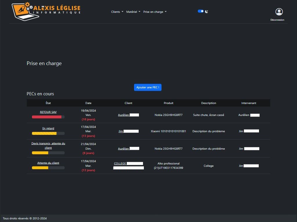 L’objectif de ce projet est de concevoir une application web qui permet aux employés de créer et de gérer les clients, les materiels, les prises en charge et les commandes au sein de l'entreprise. Egalement permettre aux clients de suivre l'avancement de la prise en charge de leurs materiels.