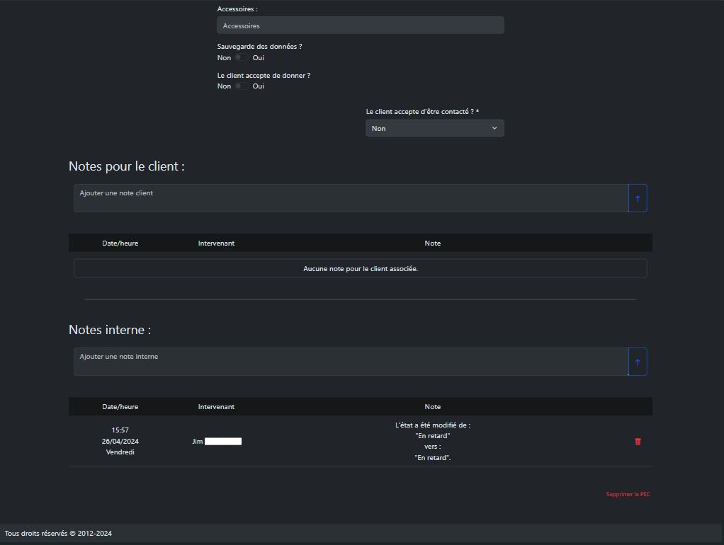 Seulement les utilisateurs avec le rôle d'admin peuvent créer et éditer des prises en charge, c'est également eux qui peuvent ajouter des notes afin d'assurer le suivi. Les admins (les employés de l'entreprise) ont accès aux informations des clients et de leurs matériels. Les utilisateurs clients, eux, ont accès uniquement à leurs informations et à leurs prises en charge personnelles.